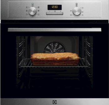 Electrolux EOH2H00BX ugradbena pećnica iz serije 300 koristi SurroundCook tehnologiju koja osigurava ravnomjernu raspodjelu toplote unutar cijelog prostora. Ventilator ravnomjerno cirkuliše zrak, što omogućava pečenje jela na više nivoa istovremeno bez potrebe za okretanjem posuđa. Unutrašnjost pećnice ima kapacitet od 72 litra i obložena je emajlom visokog sjaja koji olakšava čišćenje ostataka hrane. Uređaj posjeduje mehaničke komande za podešavanje temperature i funkcija, uz integrisani LED ekran za upravljanje tajmerom. Vanjski dio je izrađen od nehrđajućeg čelika sa premazom protiv otisaka prstiju, što olakšava održavanje estetike u kuhinji. Pećnica pripada energetskoj klasi A, što garantuje nisku potrošnju električne energije. Sigurnost je osigurana dvostrukim staklom na vratima koje zadržava toplotu unutra. Halogeno osvjetljenje pruža jasnu vidljivost tokom pripreme hrane bez otvaranja vrata pećnice.